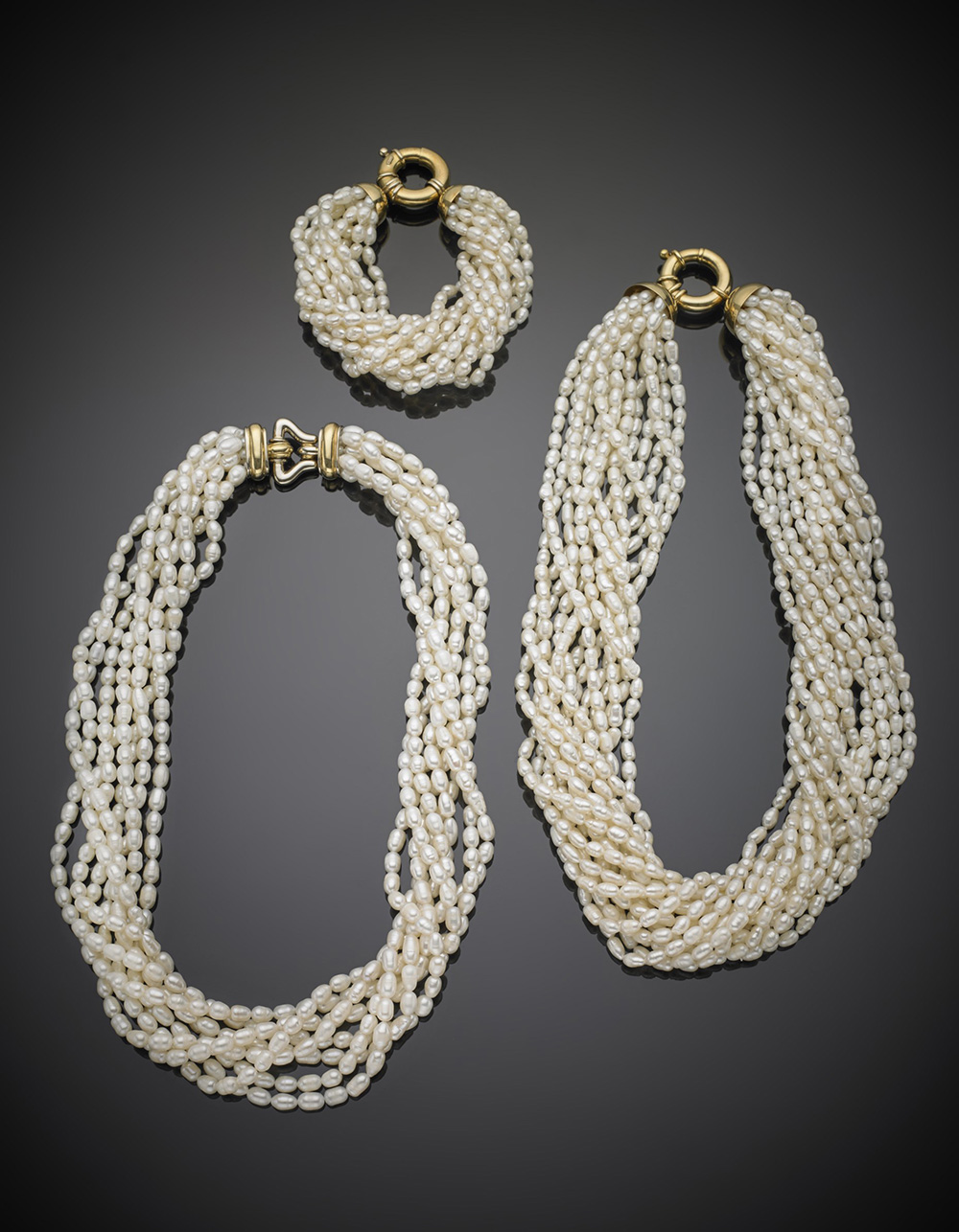 Lotto composto da due collier ed un bracciale multifili di perle bianche coltivate d'acqua dolce, tutti rilegati con tre chiusure in oro giallo e bianco, complessivi g. 439,60 Lot comprising two multi-strand sweet-water pearl necklaces and a bracelet with bi-coloured gold clasps, g.439,60