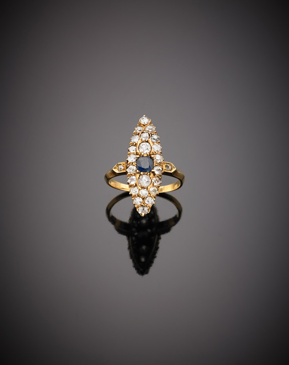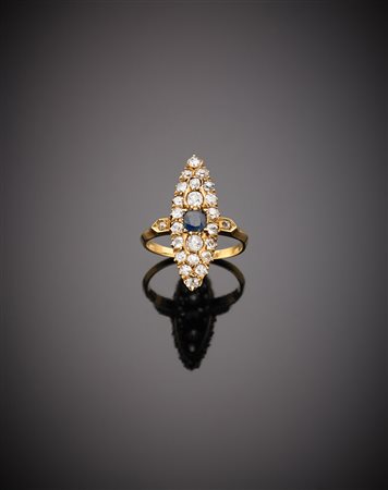 Anello in oro giallo a navette con diamanti e zaffiro centrale, g.3,70 misura 13/53 Yellow gold diamond and sapphire marquise ring, g.3,70 size 13/53