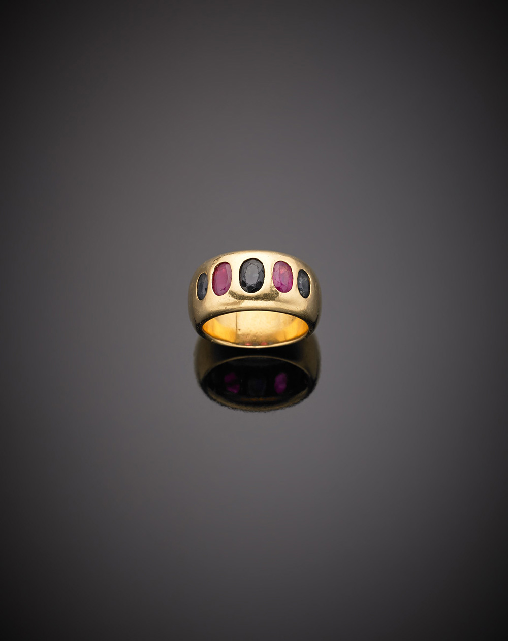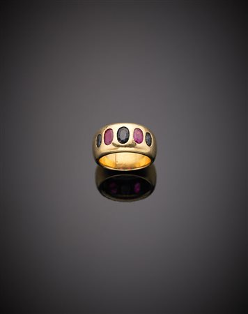 Anello a fascia in oro giallo con zaffiri e rubini ovali, g.13,00, misura...