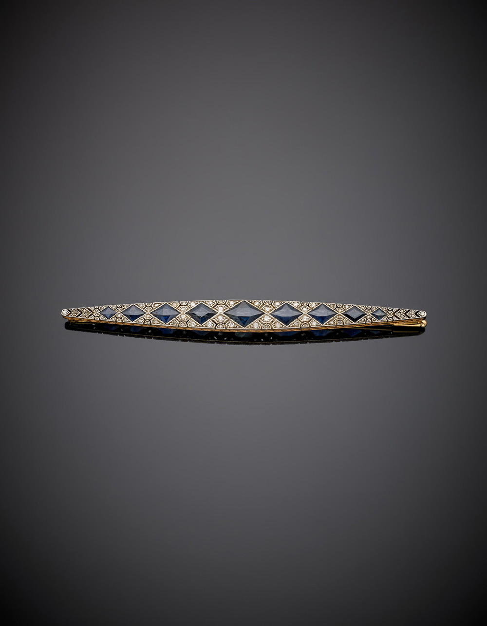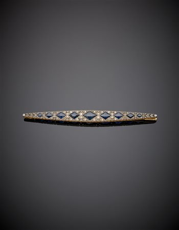 Spilla in oro e argento con diamanti irregolari taglio mezza rosetta e zaffiri scalati di forma romboidale, g. 7,90, lungh. cm 8,5 circa Gold and silver diamond brooch set with graduated rhombus cut sapphires, g. 7,90 length cm 8,5 circa