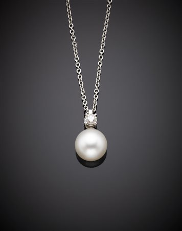 Catenina e pendente in oro bianco con diamante rotondo sopra ad una perla bianca coltivata di mm 11/11,50 circa, g.6,40 lungh. catenina cm 45 circa White gold pearl and diamond pendant with linkchain, g. 6,40 pearl diam. mm 11/11,5 chain length cm 45 c.