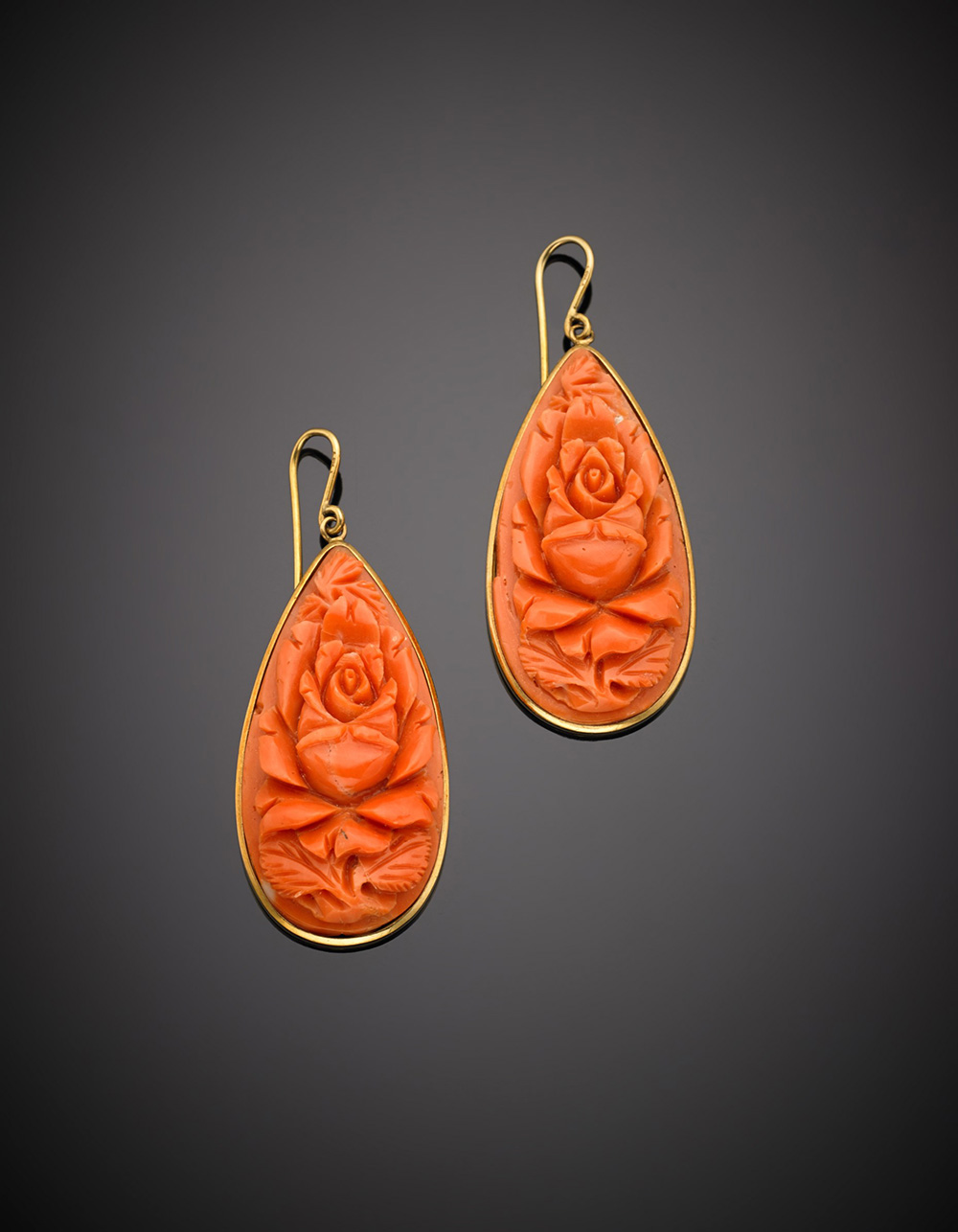 Orecchini pendenti in oro giallo e corallo a goccia scolpito, g. 27,50 Yellow gold carved coral pendant earrings, g.27,50