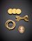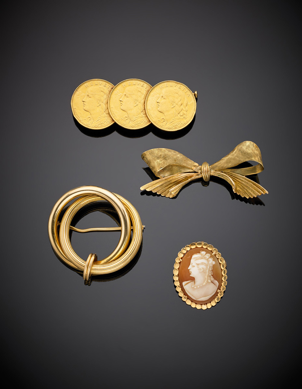 Lotto composto da quattro spille tutte in oro giallo di diversa foggia, una con cammeo e una con tre monete da 10 franchi svizzeri saldate, complessivi g.27,90 Yellow gold lot composed of four different brooches, one with a cameo and another with three coins, in all g.27,90