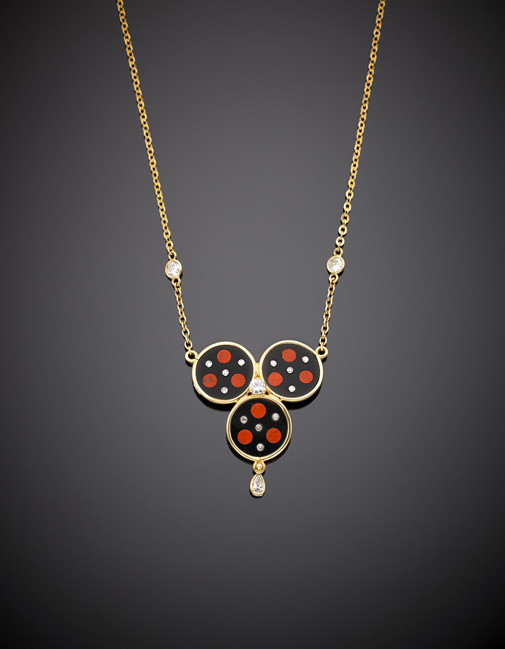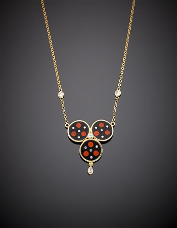 Collier in oro giallo con centrale in diamanti, onice, diaspro rosso, g.8,10, lungh. cm 43