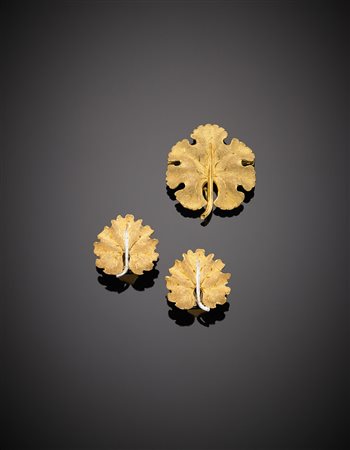 Demi-parure composta da orecchini con clip e spilla/pendente in oro giallo e bianco, satinato e lucido a forma di foglie, complessivi g.13,10 Bi-coloured partly glazed gold leaf shaped jewellery set composed of earclips and brooch/pendant, in all g.13,10