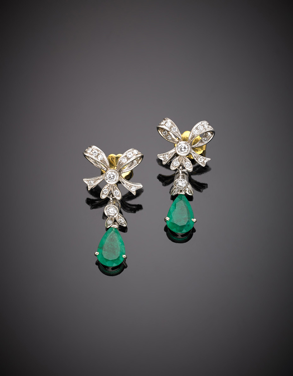 Orecchini pendenti in oro bianco a guisa di fiocco con diamanti e smeraldi a goccia per complessivi ct.2,20, chiusura in oro giallo g.6,30 lungh. cm 3 circa White gold diamond and pear emerald pendant bow earrings, yellow gold catch, emerald in all ct. 2,20 g.6,30 length cm 3 circa