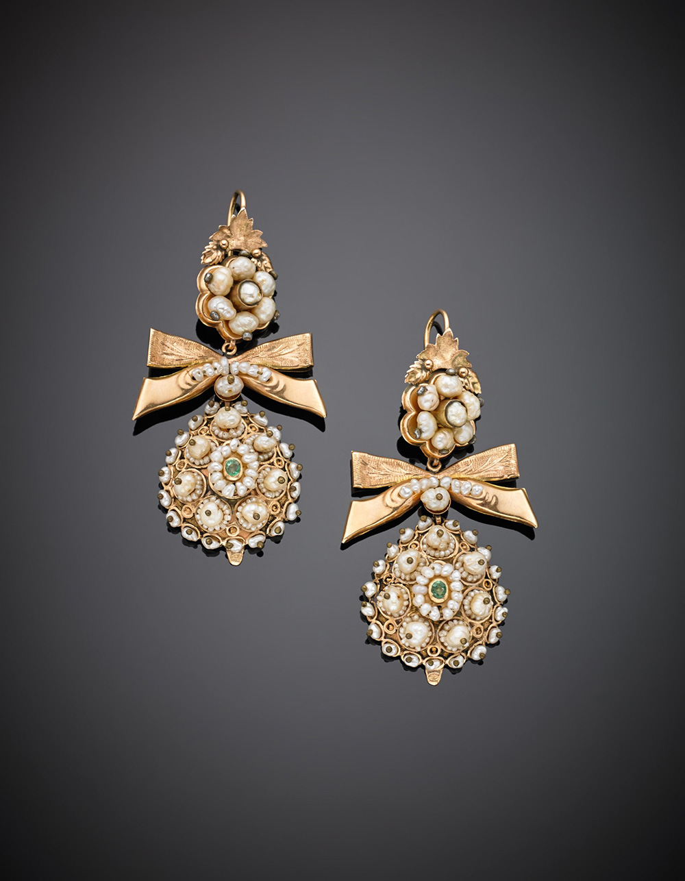 Orecchini pendenti napoletani in oro giallo rossastro 333/1000 con perle e smeraldi e un fiocco al centro, g.22,80 lungh. cm 7,20 Red 9K gold pearl and emerald "Neapolitan" pendant earrings, g.22,80 length cm 7,20