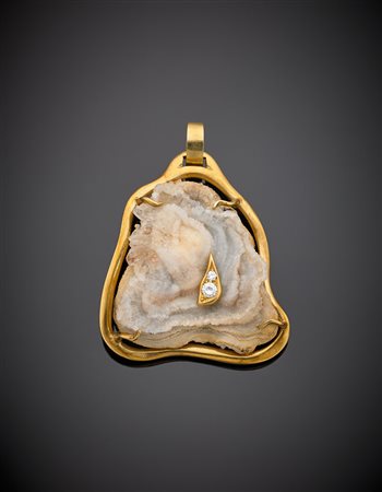 Pendente formato da minerale con parte in quarzo microcristallino irregolare, rilegato in oro giallo e rifinito con due diamanti, g. 23,70 Yellow gold and micro-cristal quartz pendant with two diamonds, g.23,70