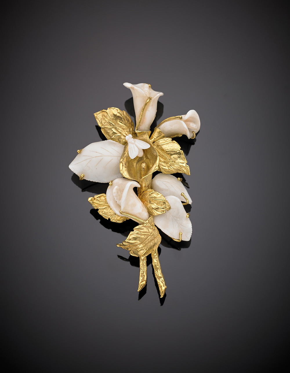 Spilla floreale in oro giallo e corallo bianco, marcato sul retro, g.27,70, lungh. cm 8,5 circa Yellow gold white coral floral brooch, marked on the back "pezzo unico", g.27,70 length. cm 8,5 circa