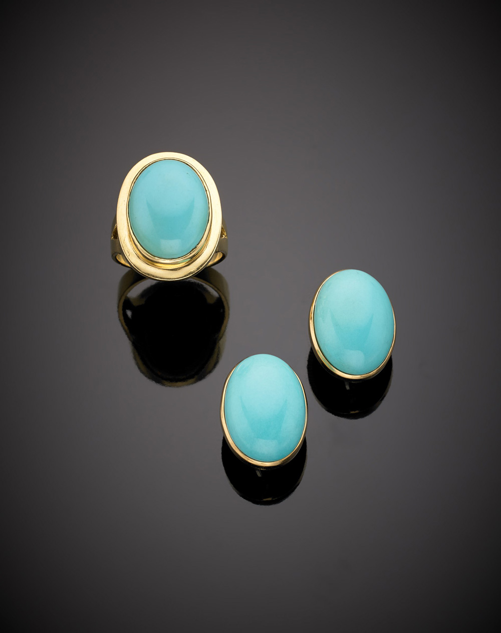 Demi-parure in oro giallo composta da anello ed orecchini con turchesi ovali...