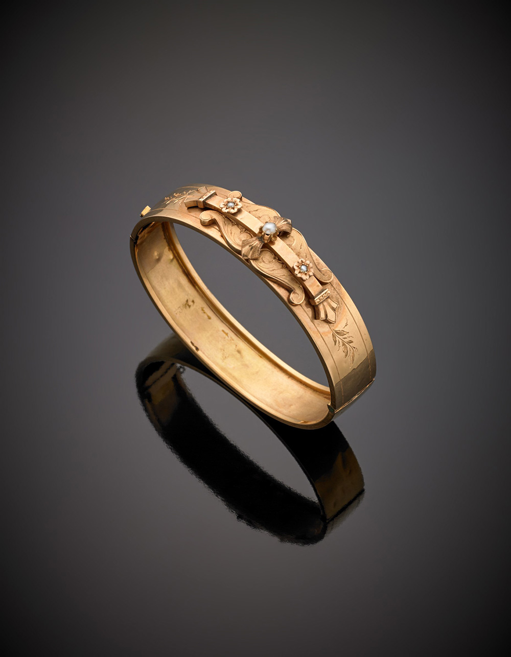 Bracciale rigido a fascia in oro giallo con piccole perle g.19,50 diam. cm 6,5 circa Yellow gold pearl bangle, g.19,50 diam. cm 6,5 circa