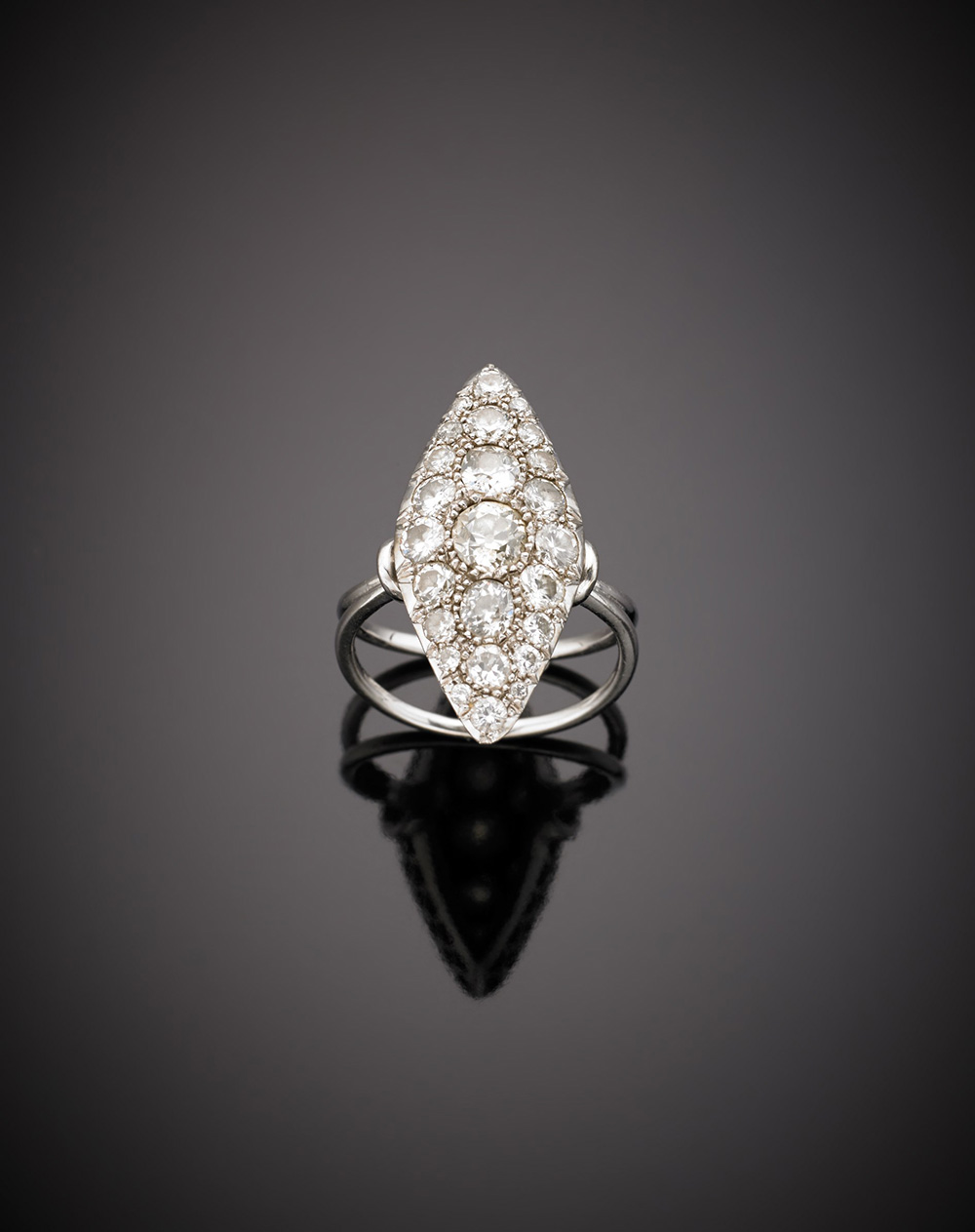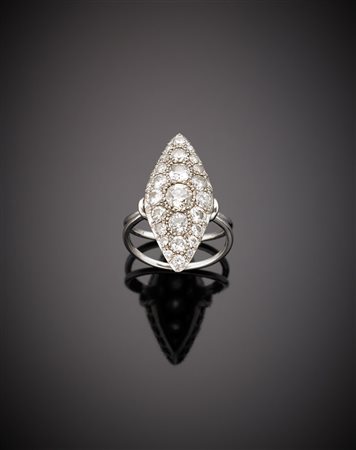 Anello a navette in oro bianco e diamanti rotondi per complessivi ct.2,50 circa, g.8,20 misura 18/58 White gold round diamond marquise ring, in all ct.2,50 circa, g.8,20 size 18/58