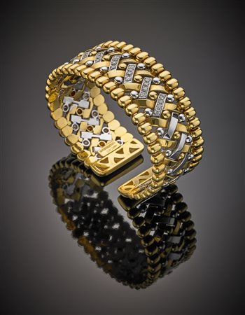 SYNTHESIS Bracciale intrecciato semirigido alla schiava in oro giallo e bianco con diamanti rotondi, g.83,90, diam. cm 6 circa, h. cm 2,5 circa SYNTHESIS Bi-coloured gold interwoven diamond bangle g.83,90 diam cm 6 circa h. cm 2,5 circa