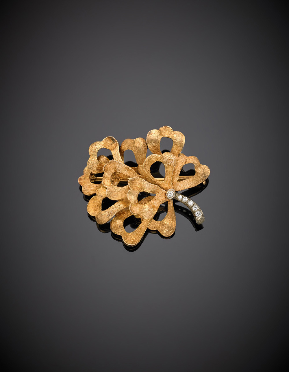 Spilla in oro giallo e argento a guisa di foglia con pietre incolori g.7,50, cm.3,5 circa Yerllow gold and silver colourless stone leaf brooch g.7,50 cm.3,5 circa