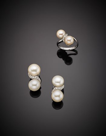 Demi-parure composta da orecchini e anello in oro bianco, perle bianche e diamanti, g.18,80 anello misura 18/58 White gold set composed of ring and earrings with white pearls and diamonds, g.18,80 ring size 18/58
