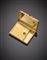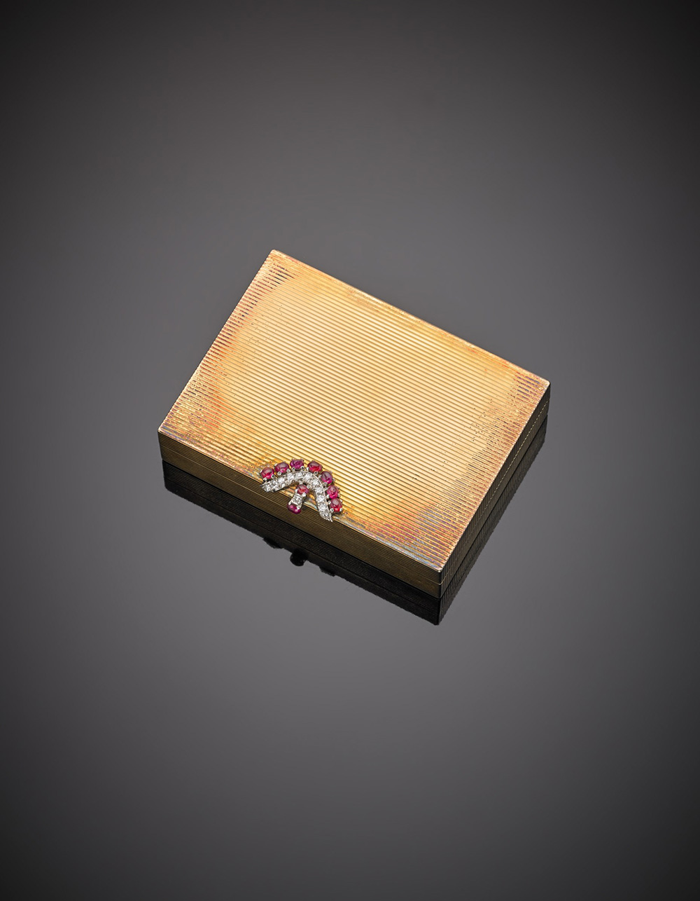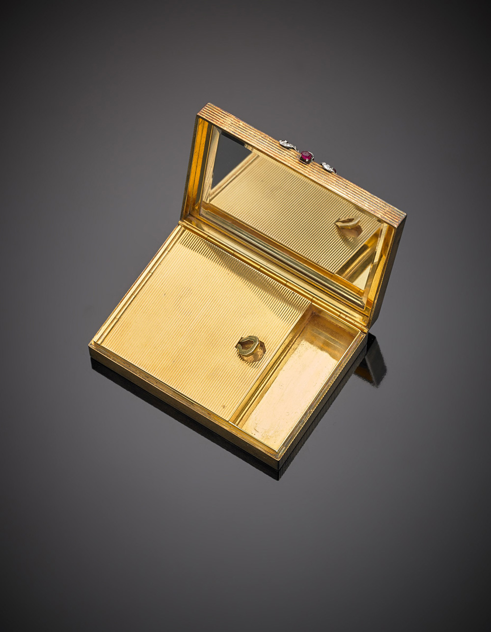 Portacipria con parte esterna in oro, diamanti, rubini mentre la parte interna in argento dorato, marchio del fascio, g.187,10 cm 7,5x5,5x1,6. Con astuccio Yellow gold compact with diamond and ruby clasp, inner parts in silver gilt, Italian "fascio" mark, g.187,10 measurements cm 7,5x5,5x1,6, with original pouch