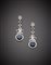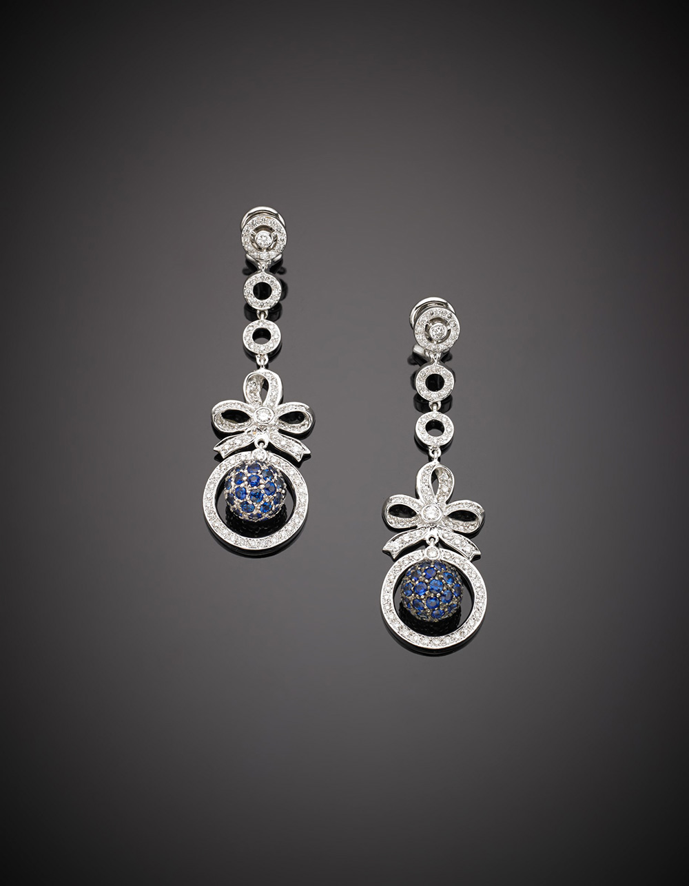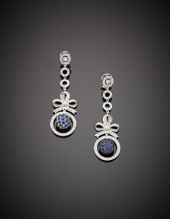 Orecchini pendenti in oro bianco con diamanti e due boules di pavé di zaffiri, una rodiata nera g.13,50 lungh. cm 5 circa White gold diamond sapphire pavé bead pendant earrings, one bead in black gold, g.13,50 length cm 5 circa