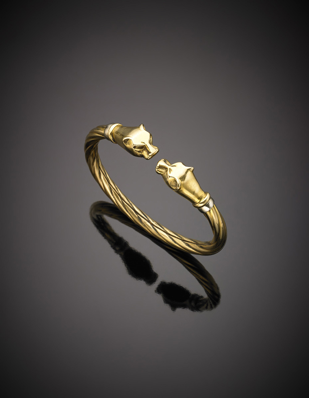 Bracciale in oro giallo ritorto alla schiava con teste di leonesse, g.25,00 diam. interno cm 6 circa Yellow gold twisted lioness head cuff bracelet, g.25,00 inner diam. cm 6 circa