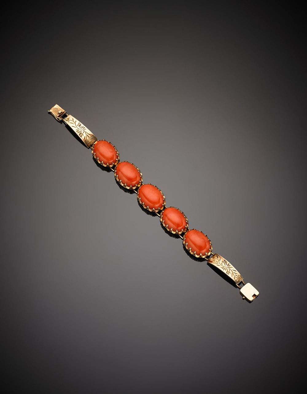 Bracciale modulare in oro giallo 333/1000 cesellato e corallo rosso/arancio cabochon, g.23,60 lungh. cm 17 circa