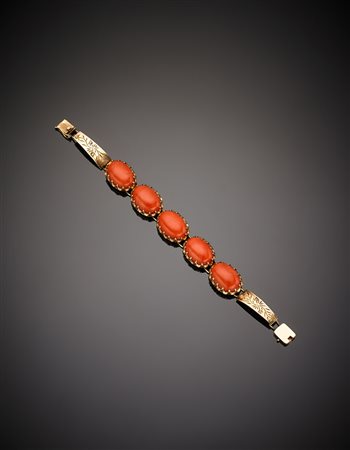 Yellow chiselled 9K gold and red/orange cabochon coral modular bracelet, g,23,60 length cm 17 circa