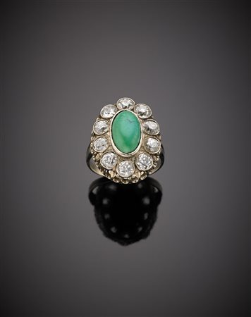 Anello in oro bianco e argento con dieci diamanti rotondi taglio vecchio europeo per complessivi ct 2,40 circa ed al centro un turchese ovale cabochon, g.7,40, misura 18/58 White gold and silver cabochon turquoise ring set with ten old european cut diamonds in all 2,40 ct, g. 7,4 size 18/58