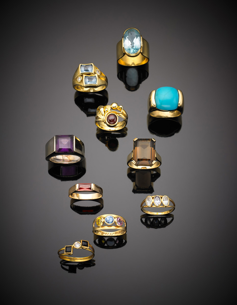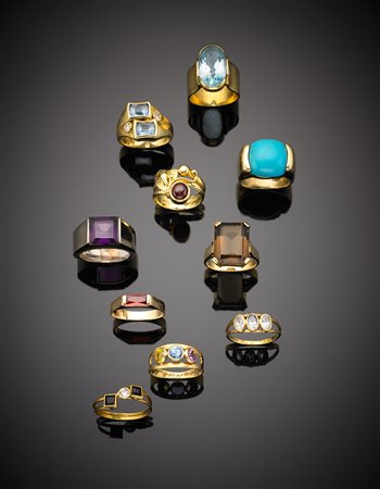 Lotto di dieci anelli in oro giallo e bianco con gemme varie naturali e sintetiche, complessivi g.55,10 misure da 11/51 a 15/55 Lot of ten white, yellow natural and synthetic gem set rings, in all g.55,10 size from 11/51 to 15/55