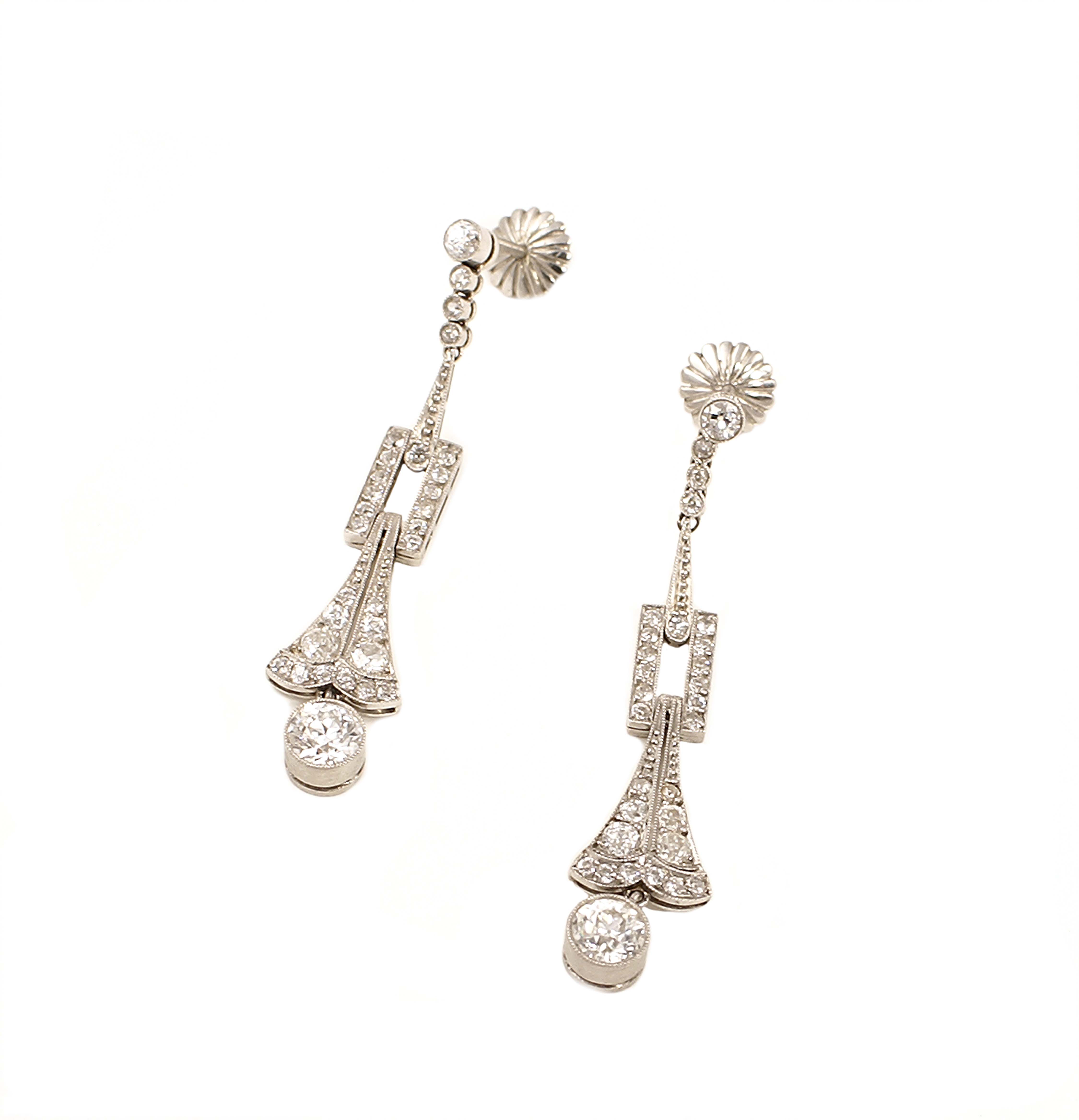 Orecchini Decò in platino con incastonati diamanti taglio brillante antico per carati 1,40 circa e due diamanti taglio brillante antico pendenti per carati 1,20 circa, gr. 6,1.