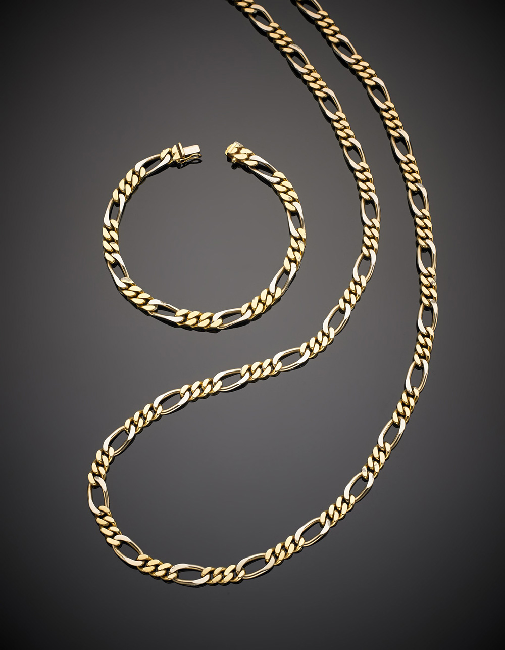Collana lunga con bracciale in oro giallo e bianco a maglia groumette piatta, g.128,10, lungh. collana cm 89,00 lungh. bracciale cm 19,50 circa Bi-colured gold groumette linkchain necklace and bracelet, g.128,10 necklace length cm 89,00 bracelet length cm 19,50 circa