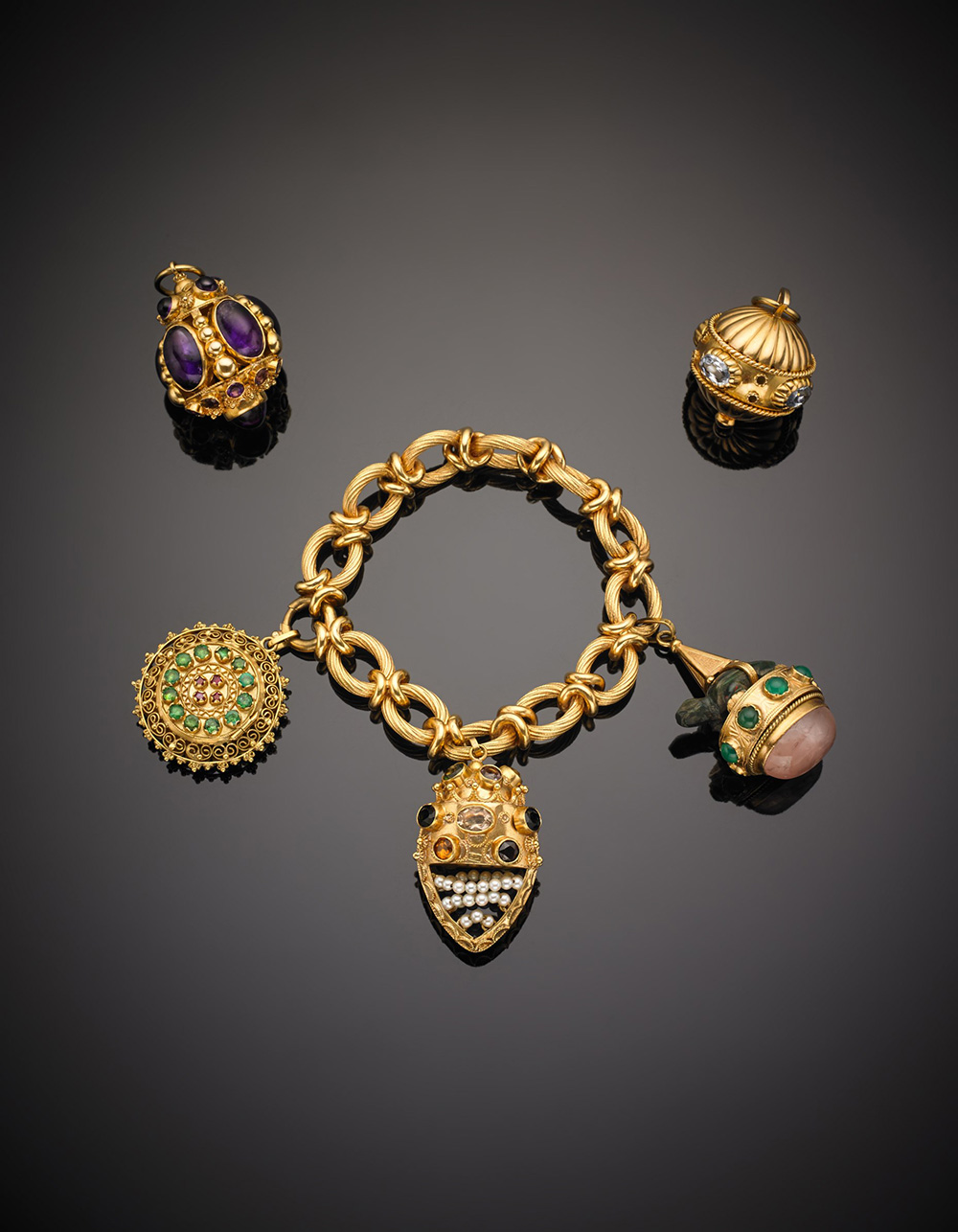 Bracciale in oro giallo con charms, rifiniti con gemme varie, g. 113,20...