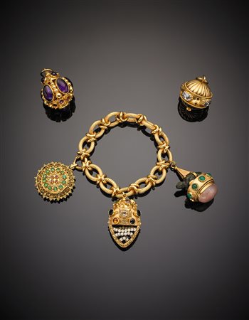 Bracciale in oro giallo con charms, rifiniti con gemme varie, g. 113,20 Yellow gold linkchain gem set charms bracelet, g.113,20