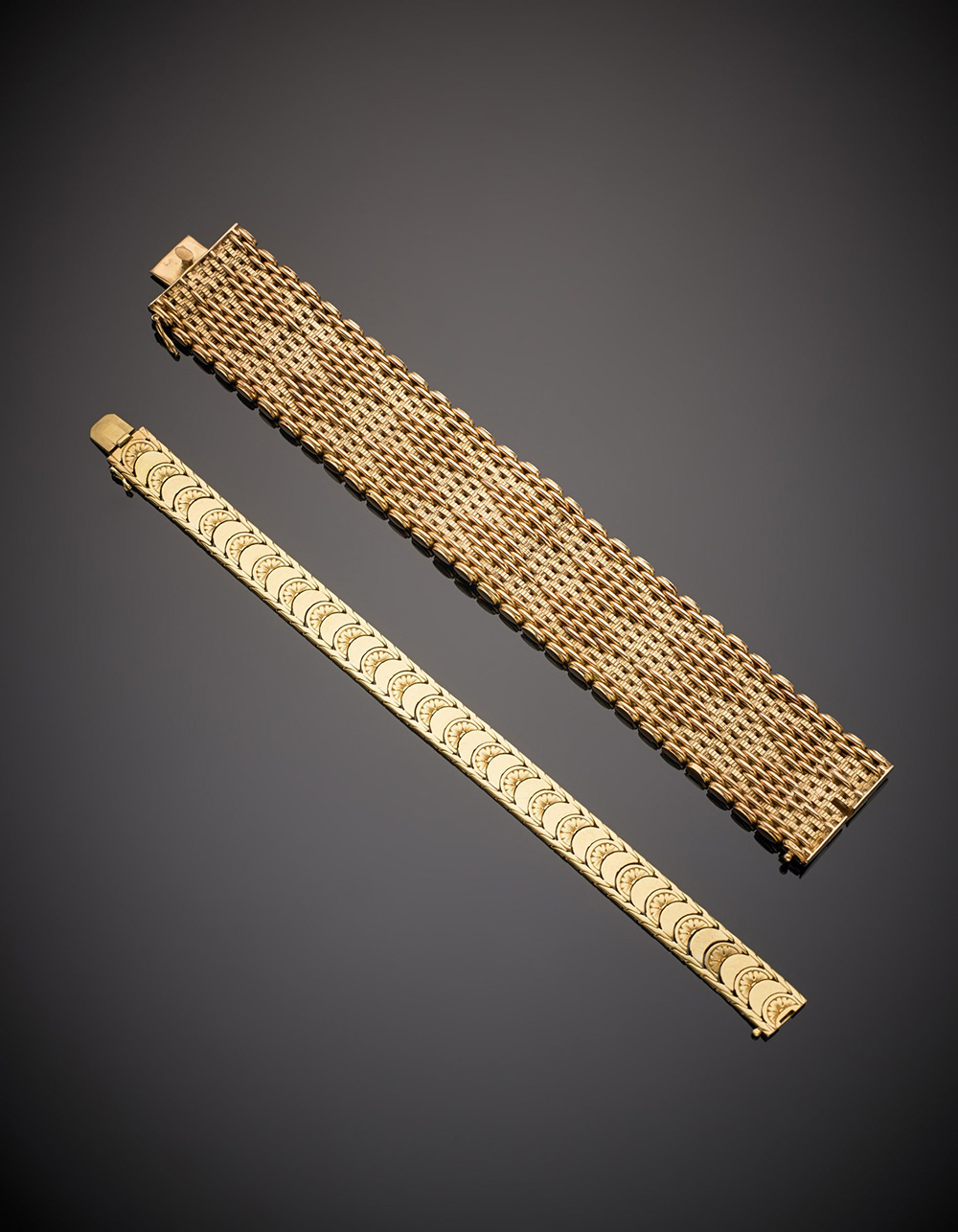 Due bracciali in oro giallo e rosso, complessivi g. 84, lungh. cm 18 e h rispettivamente di cm 1 e cm 2,80 circa Two yellow and red gold chiselled band bracelets, in all g.84 circa, length cm 18, h respectively cm 1 and cm 2,80 circa