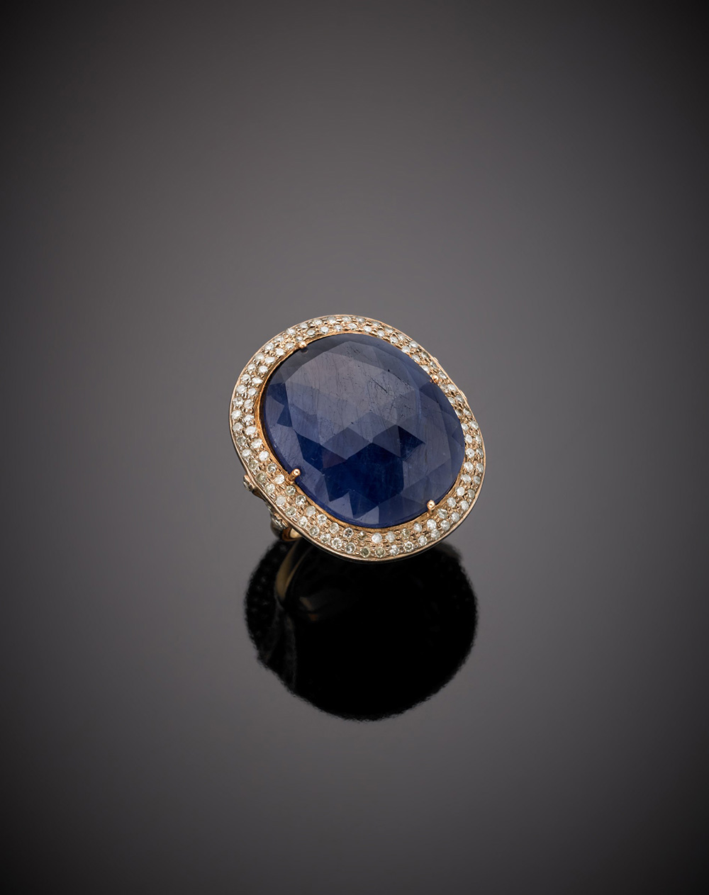 Anello in oro e argento con zaffiro ovale contornato da diamanti, g.11,20,...
