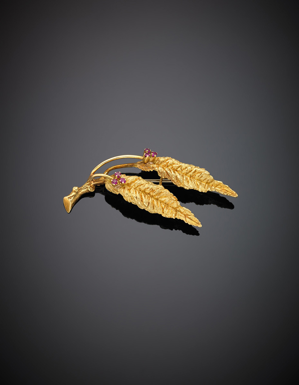 Spilla in oro giallo satinato a guisa di foglie e rubini, g.8,50 lungh. cm 5,6 circa Yellow glazed gold ruby leaf brooch, g.8,50 length cm 5,6 circa