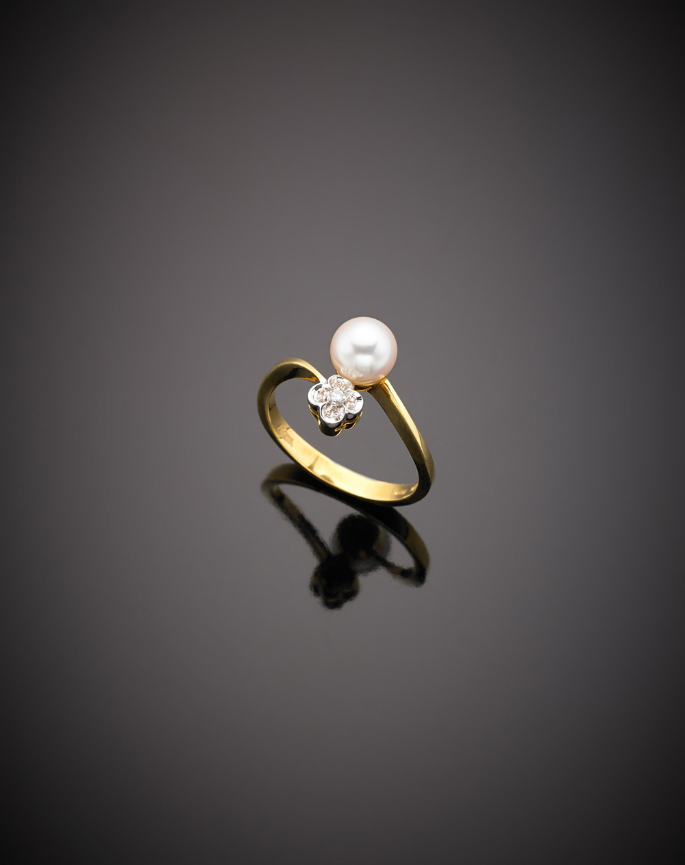 Anello in oro giallo e bianco a contrarié con perla e diamante, g.3,90 misura 15/55 Bi-coloured gold pearl and diamond crossover ring, g.3,90 size 15/55