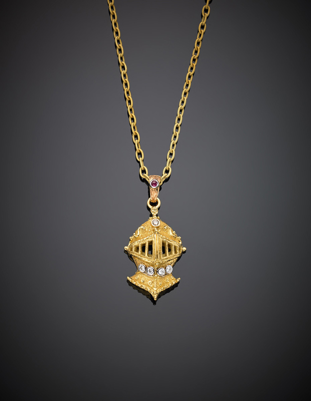 CAZZANIGA Catena con pendente a guisa di elmo in oro giallo, bianco e rosa, cesellato, con diamanti incolori, fancy e rubino, g. 25,70 lungh. cm 50 circa CAZZANIGA Tri-coloured chiselled gold chain and helmet pendant with colourless and fancy diamonds and a ruby