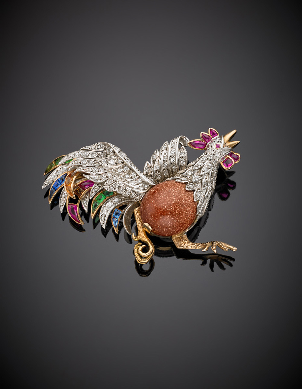 ABATE-Sanremo Broche a guisa di gallo in oro giallo e bianco con grande cabochon in pietra di sole, rifinita con diamanti, rubini, smeraldi, zaffiri e quarzi citrini, g. 22,70, largh. cm 6 circa (mancanze) ABATE-Sanremo Bi-coloured gold cock brooch with red sun-stone accented with diamonds, rubies, emeralds, sapphires and citrine quartzs, g.22,70 width cm 6 (losses)