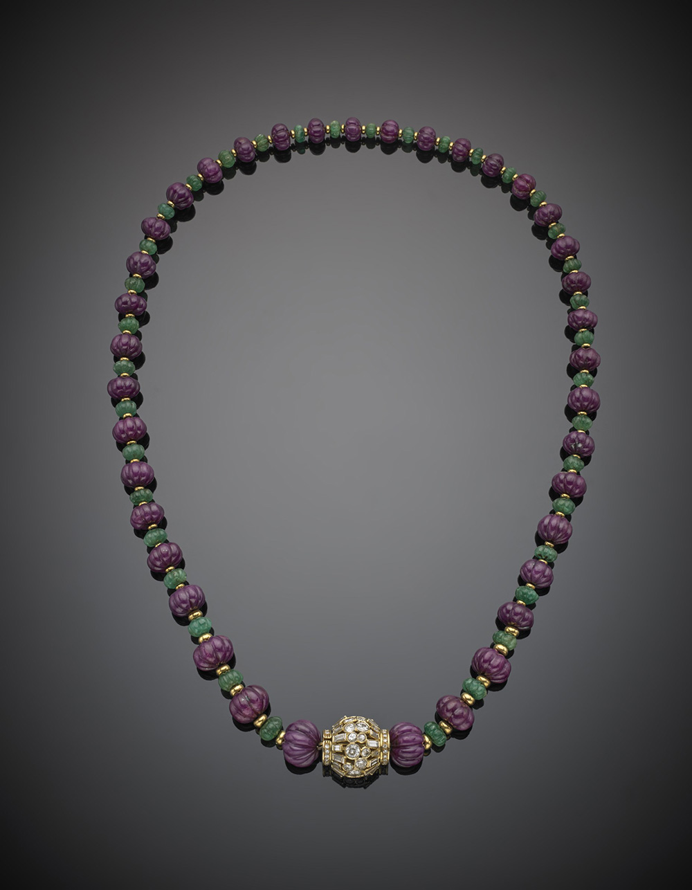 TRABUCCO Collana a scalare in boules di rubino e smeraldo scolpito distanziate in oro giallo, chiusura a barilotto in oro giallo con diamanti rotondi e baguette per complessivi ct. 7 circa, g. 141, lungh. cm 67 TRABUCCO Graduated carved ruby and emerald necklace with yellow gold spacers and yellow gold and diamond clasp, g.141 circa length cm 67