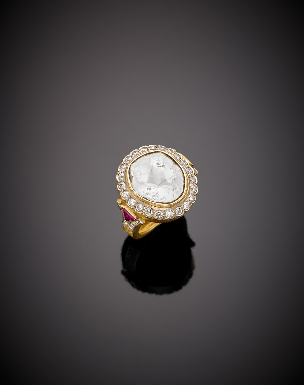 Anello in oro giallo in "stile indiano", centrato da un diamante irregolare, flat incolore di mm 15x13 circa contornato da diamanti taglio brillante e trattenuto da due rubini triangolari sul gambo, g.9,9 misura 12/52 Yellow gold "indian style" ring with a central colourless irregular flat diamond of mm 15x13 circa, with adiamond surround and accented with two triangular rubies on the stem g.9,9 misura 12/52