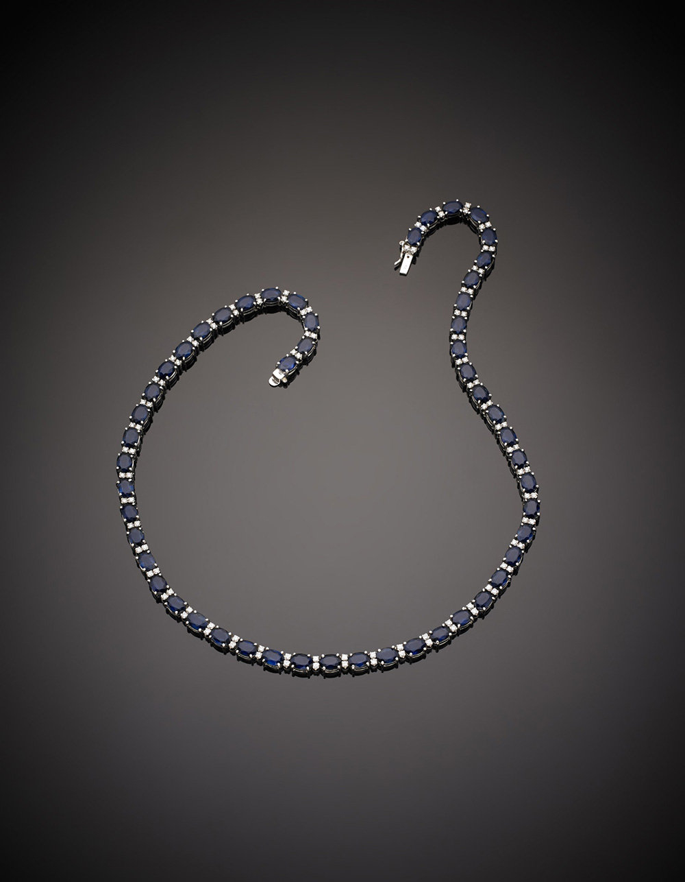 Collier in oro bianco, diamanti rotondi e zaffiri ovali per complessivi ct.55 circa g.40,80 lungh. cm 45,5 White gold diamond and oval sapphire necklace, sapphire in all ct.55 g.40,80 length cm 45,5