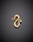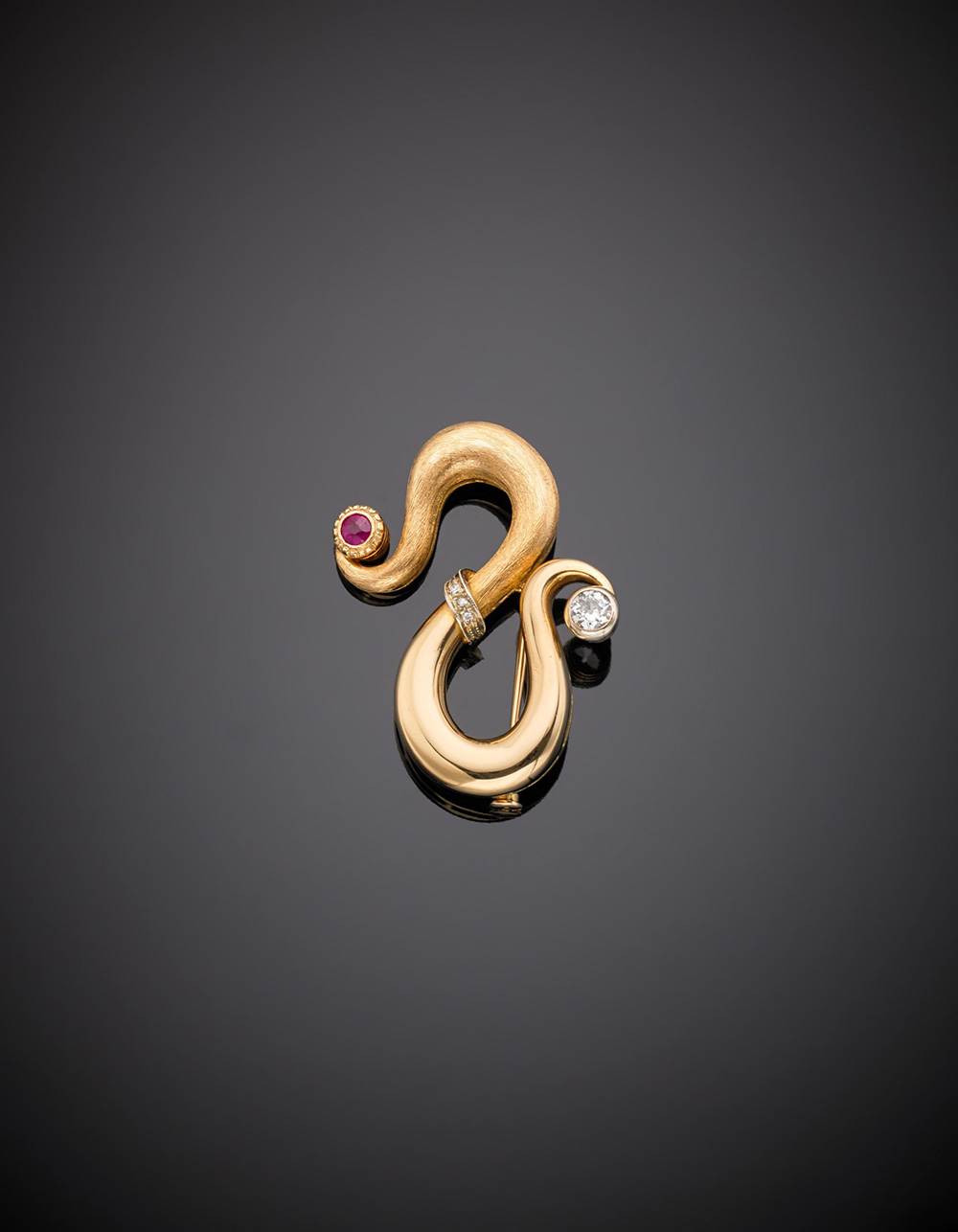 Spilla in oro giallo lucido e satinato rifinita in oro bianco con diamanti e un rubino, il diamante principale di ct. 0,40 circa, g.13,40, lungh. cm 4,4 circa Yellow partly glazed gold diamond and ruby brooch accented in white gold and diamonds g.13,40 cm 4,4 circa