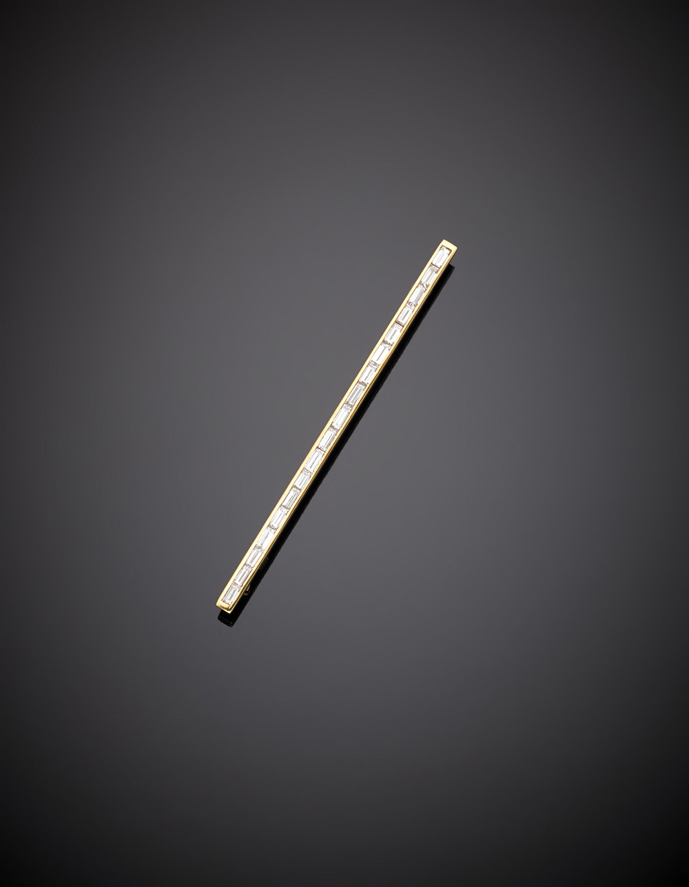 Yellow gold diamond baguette bar brooch, g.5,30 length cm 7 circa