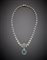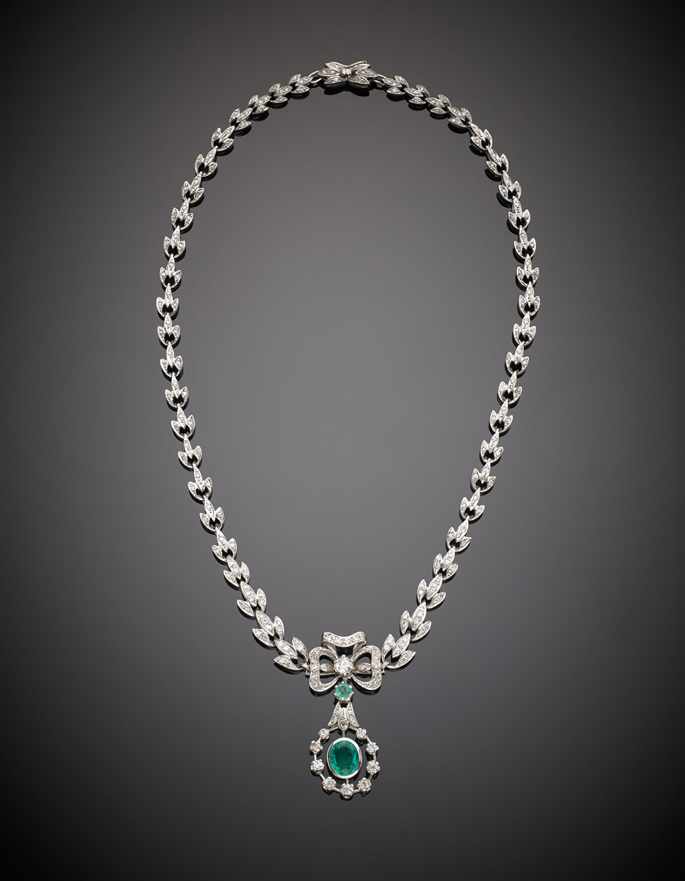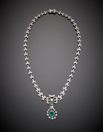 Collier a scalare in oro bianco e diamanti a guisa di foglioline con al centro un fiocco con smeraldo ovale, g.46,50, lungh. cm 46 circa White gold and diamond graduated leaf necklace with a central oval emerald bow, g.46,50 length cm 46 circa