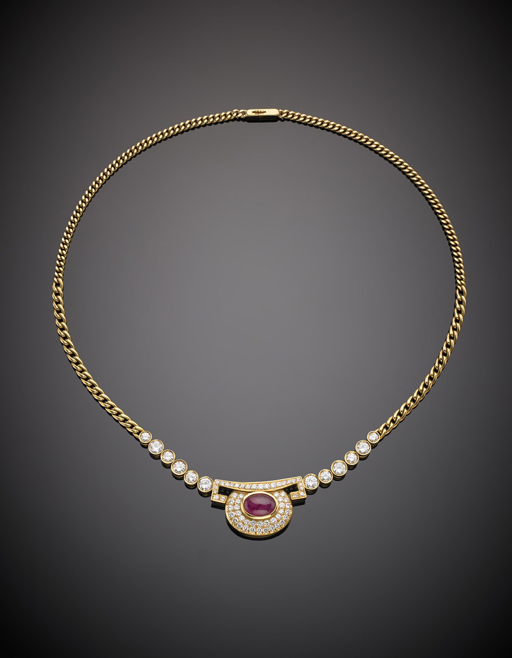 Collier in oro giallo e centrale con diamanti rotondi e rubino ovale cabochon di ct.3,95 circa, g.31,10 lungh. cm 44 circa Yellow gold necklace with oval ct.3,95 ruby and round diamond central, g.31,10 length cm 44 circa