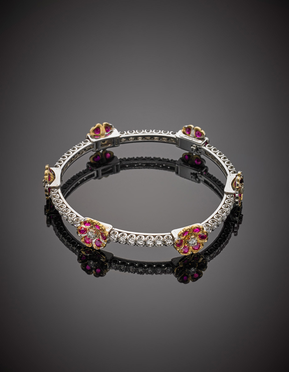 MISSIAGLIA Bracciale in oro giallo e bianco con diamanti e rubini a formare sei piccole primule, g. 19,70, lungh. cm 18 circa MISSIAGLIA Bi-coloured gold, ruby and diamond bracelet with six small primroses g. 19,70 length cm 18 circa