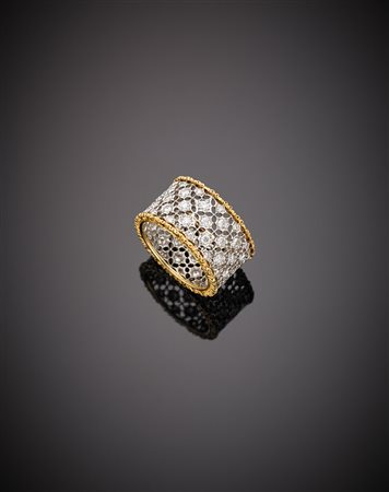 BUCCELLATI Anello a fascia traforata a pizzo in oro giallo e bianco con diamanti rotondi, g.7,40, misura 15-17/55-57. Numero di serie U305 BUCCELLATI Bi-coloured gold diamond lace openwork band ring, serial number U305, g.7,40 size 15-17/55-57