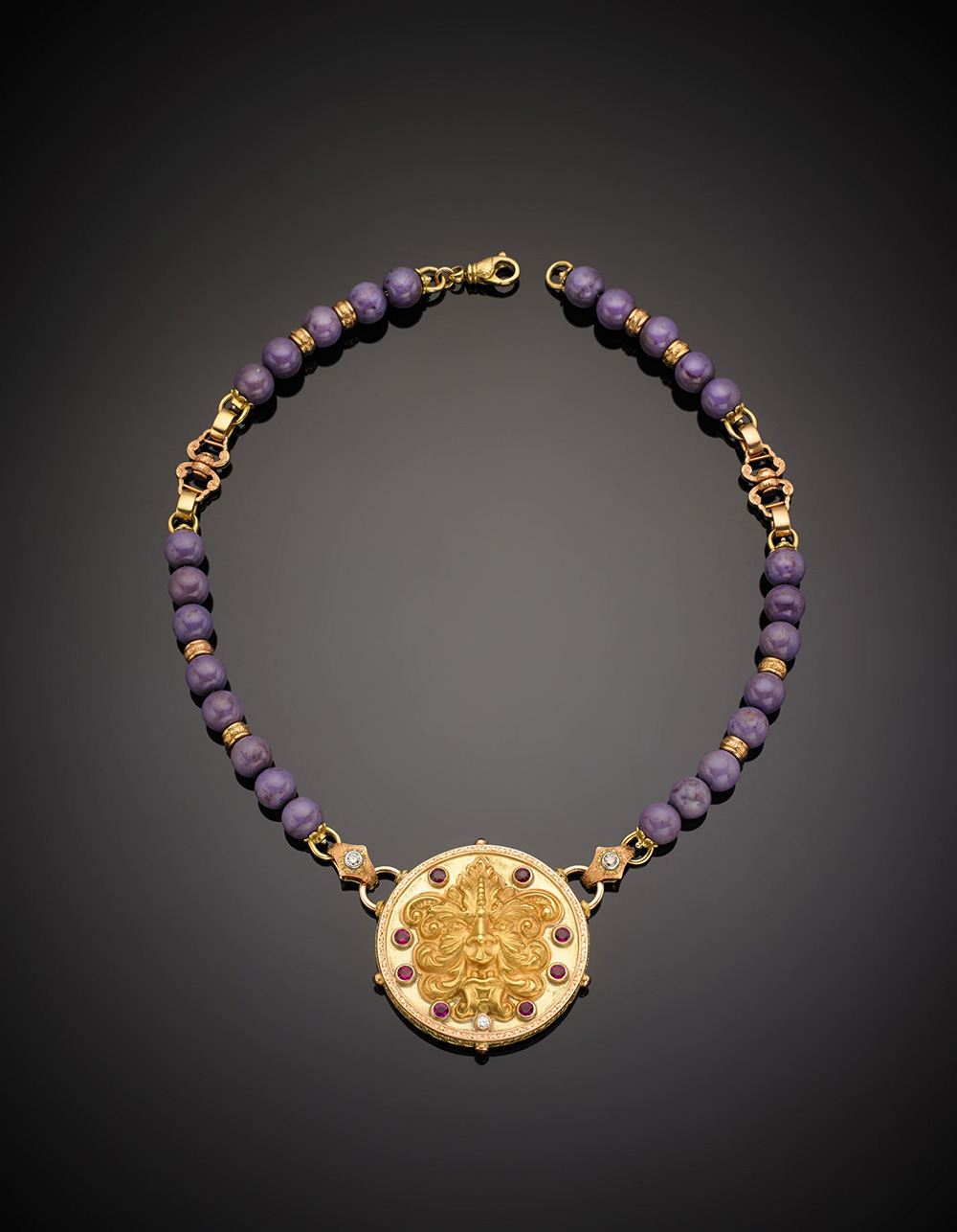 CAZZANIGA Collier in boules di giadeite lilla con centrale a mascherone,...