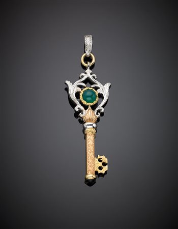 CAZZANIGA Pendente a guisa di chiave in oro bianco, giallo e rosa, cesellato e rifinito con zaffiro e giadeite, g. 9,90, lungh. cm 6 circa CAZZANIGA Tri-coloured chiselled gold jadeite and sapphire pendant, g. 9,90, length cm 6 circa