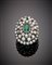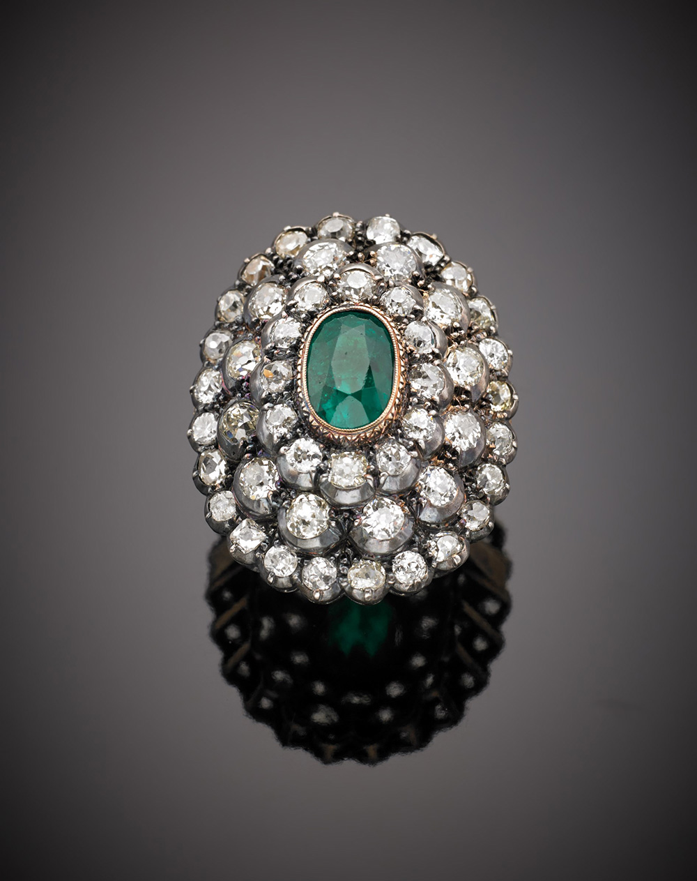 Anello a cupola, ovale, in oro giallo e argento con smeraldo ovale di ct 3,80 circa e diamanti, g.15,00, misura 15/55 Yellow gold and silver diamond and ct.3,80 oval emerald dome ring, g.15,00 size 15/55