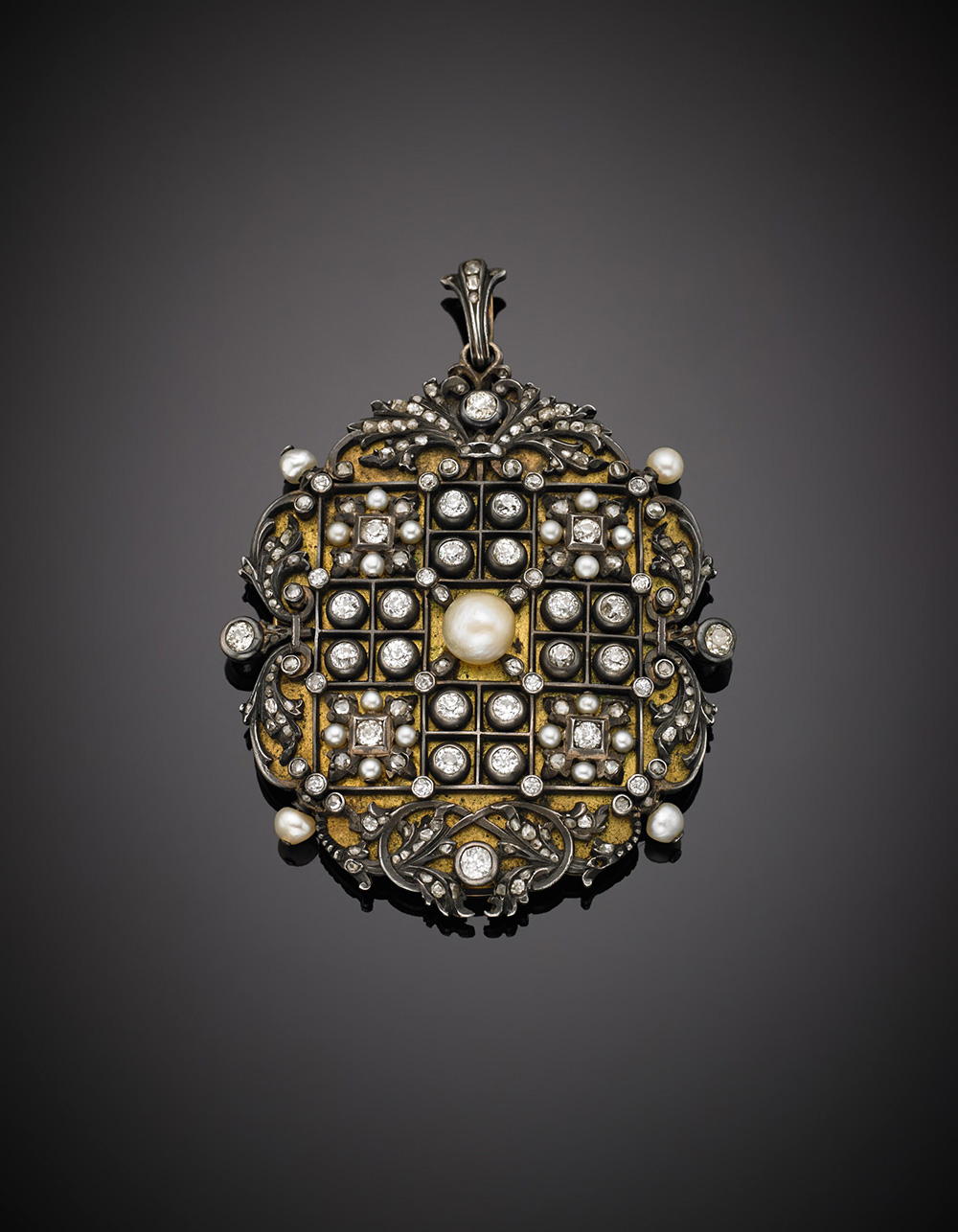 Pendente porta ricordi in oro, argento, diamanti e perle, g. 90, h cm 8, 5. chiusura sul retro in vetro. Prov.: Eredi Luchino Visconti Yellow gold and silver, diamond and pearl pendant/locke, g.90, h cm 8,5. Glass on the back hinged opening Prov.: Eredi Luchino Visconti