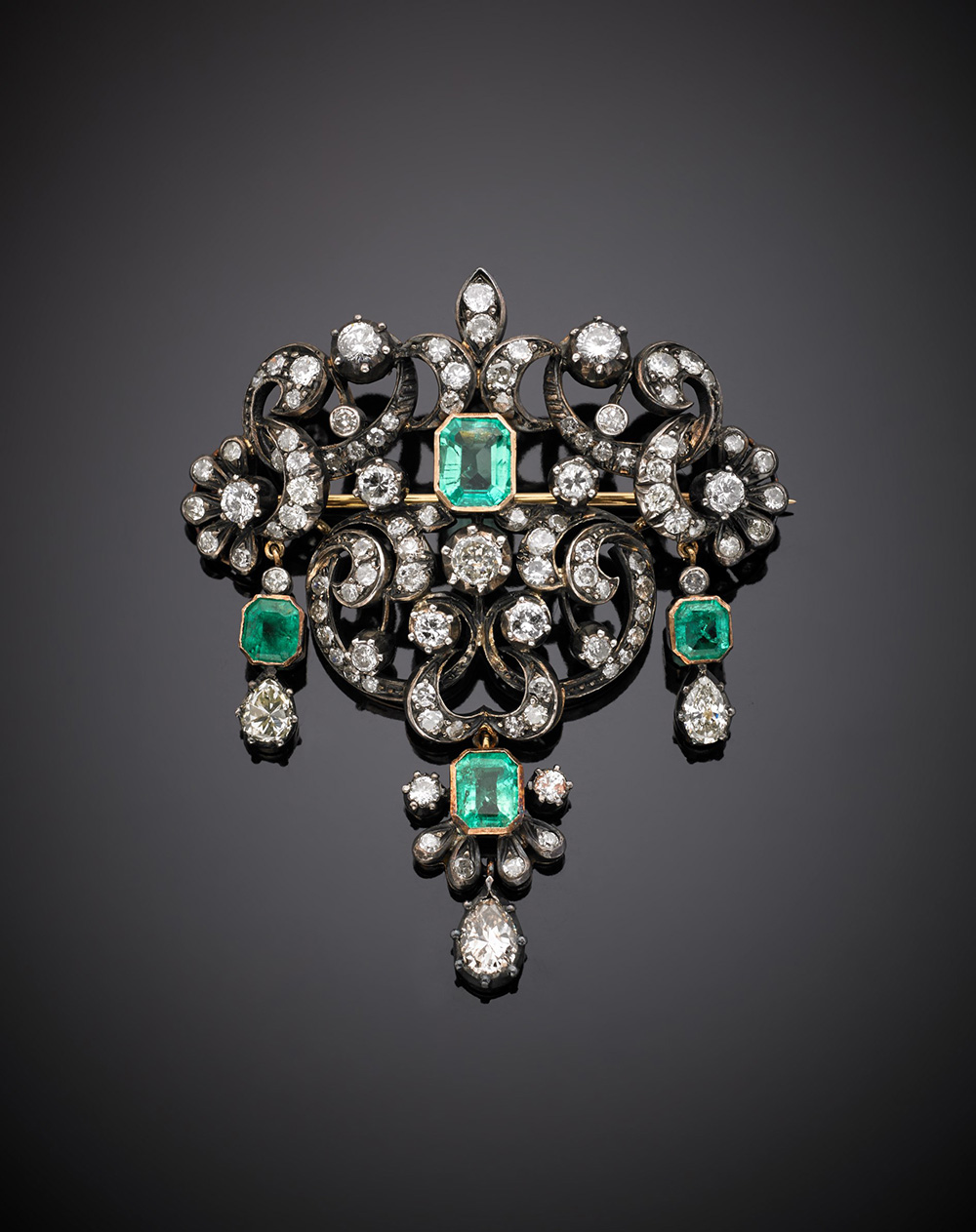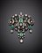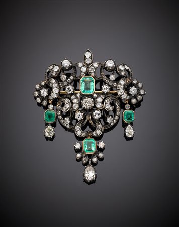 Spilla in oro giallo e argento con diamanti rotondi e smeraldi ottagonali,...